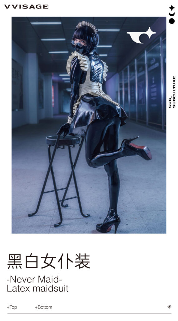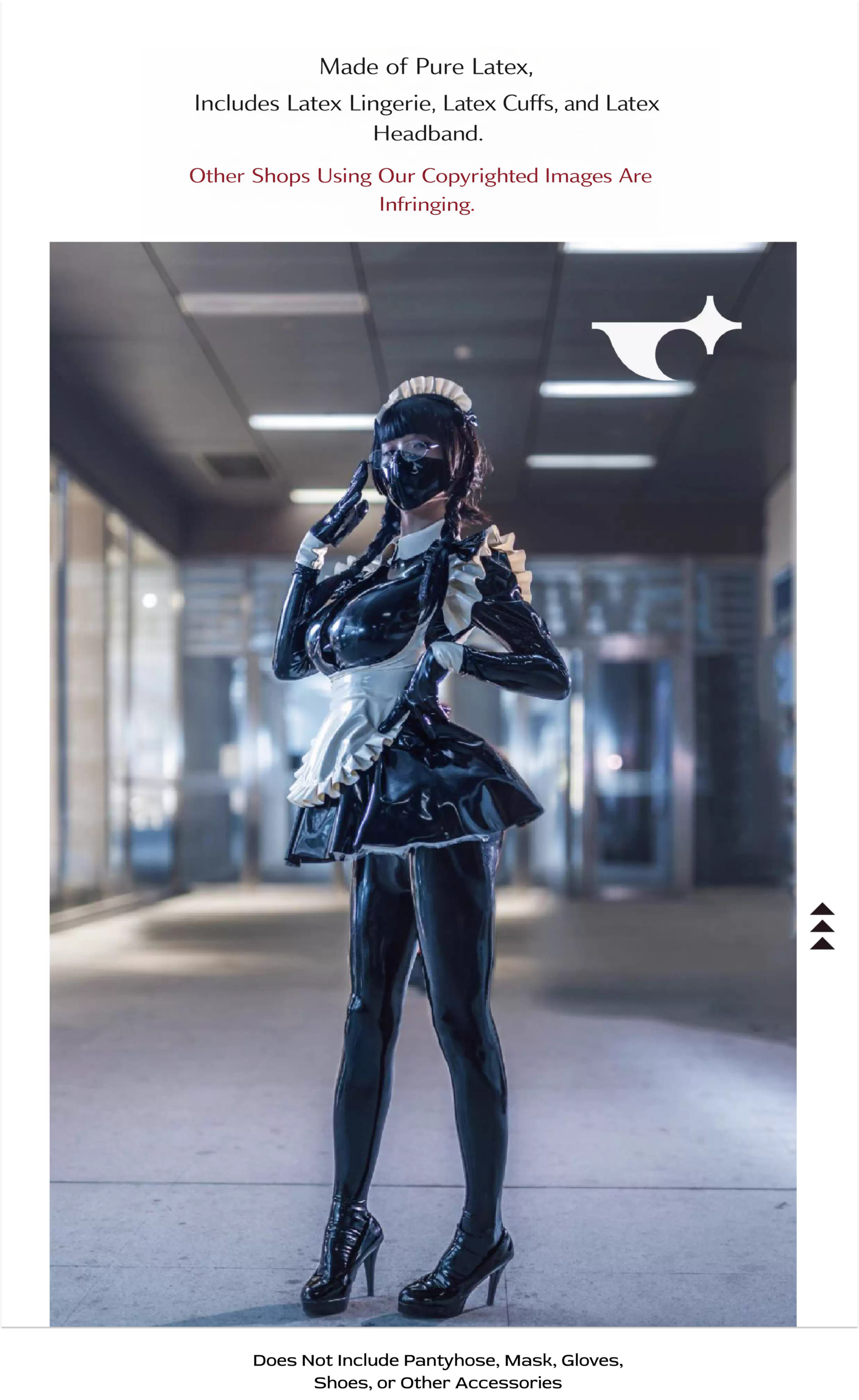A classic maid-inspired latex outfit in black and white tones. Crafted with precision for a flattering and playful silhouette.