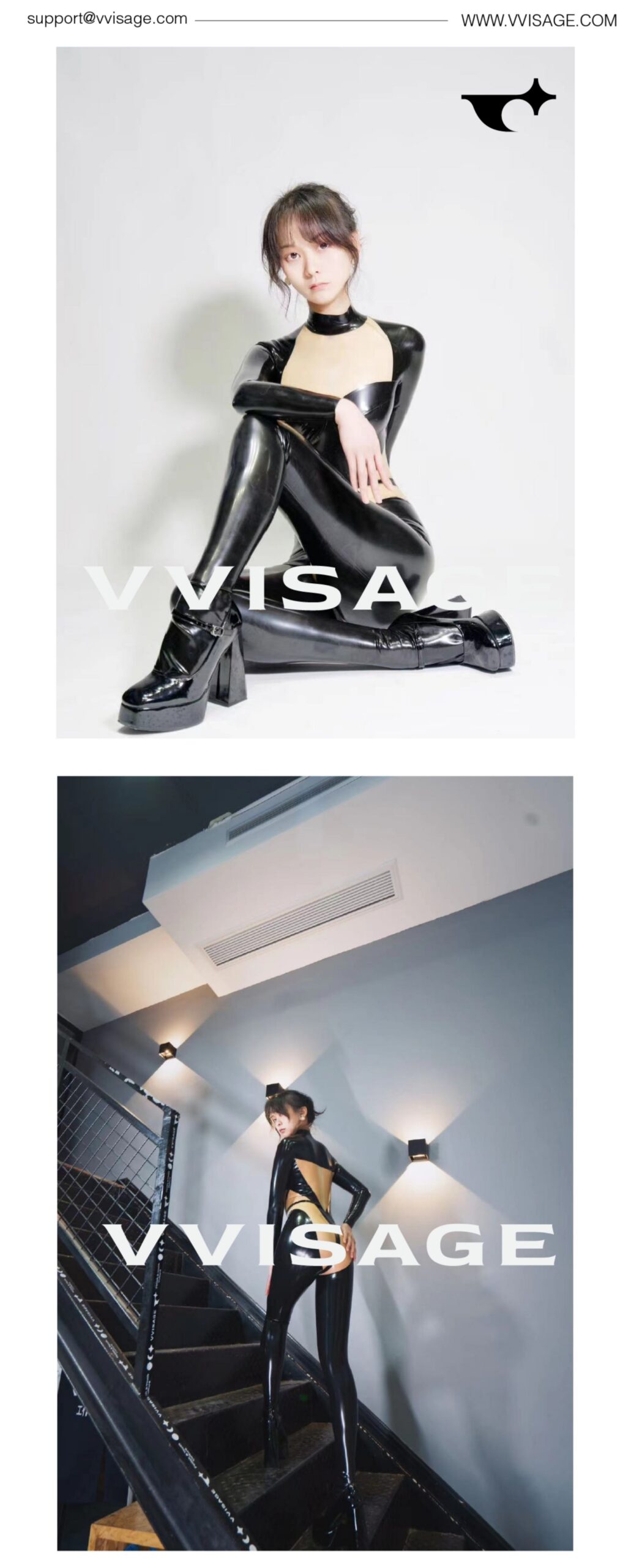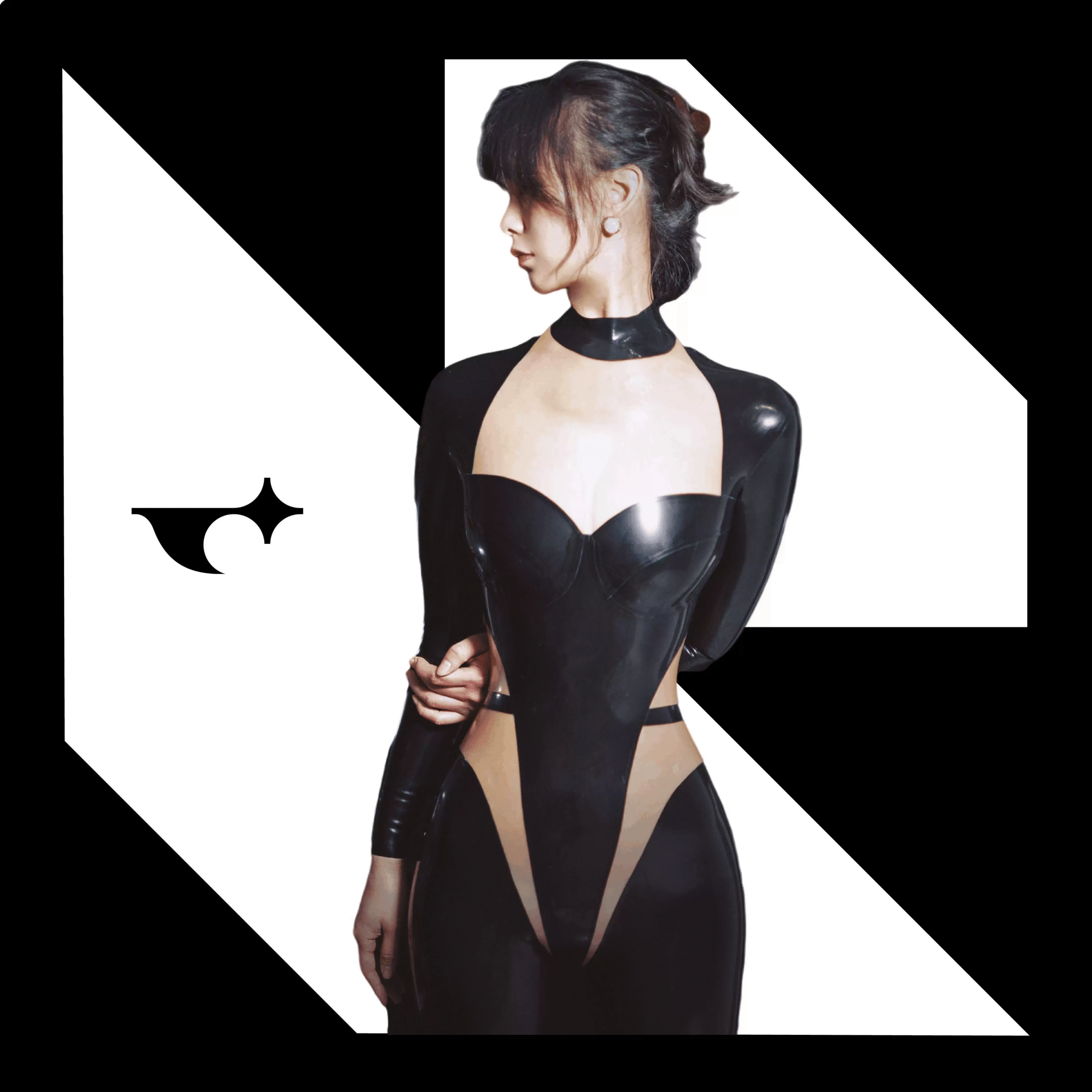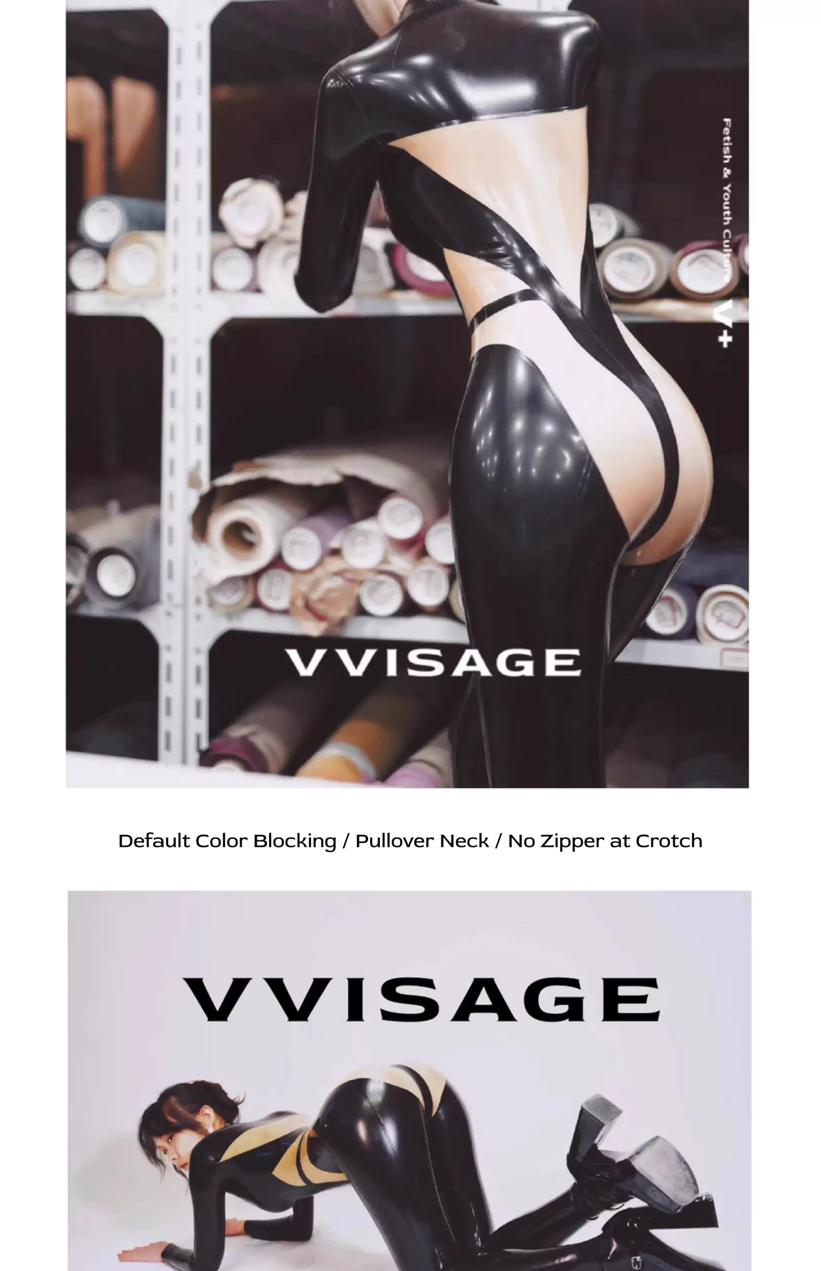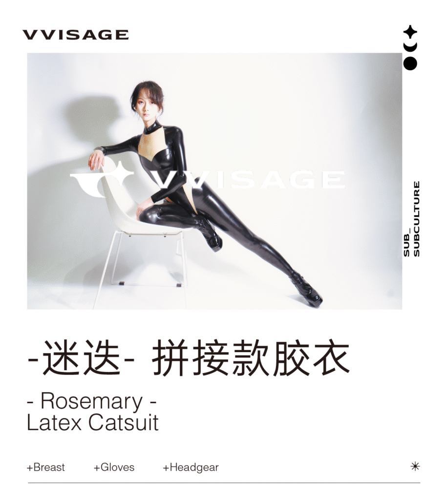 A creative patchwork latex catsuit with contrast panels. Tailored for both artistic visual impact and comfort.
